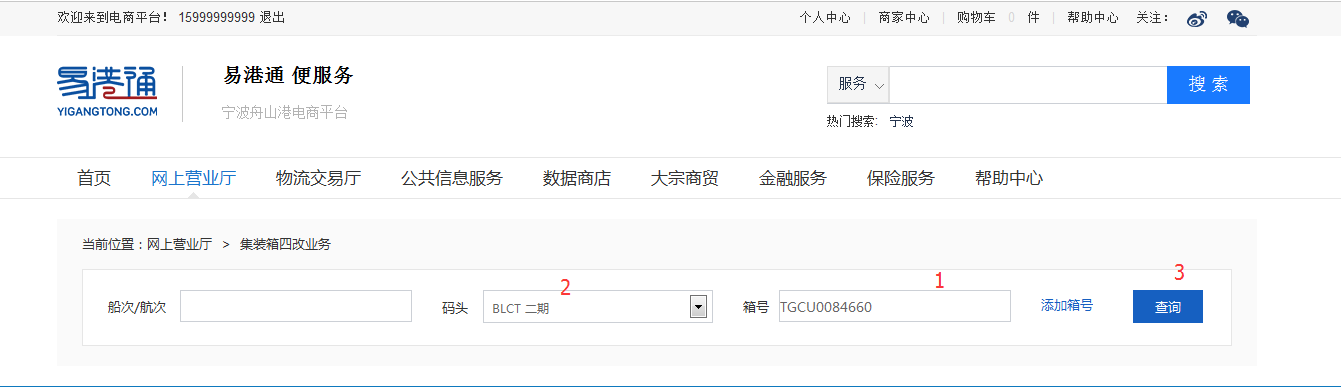 示例箱號(hào)TGCU0084660 (1輸入完整箱號(hào),2選擇碼頭,3點(diǎn)擊查詢)