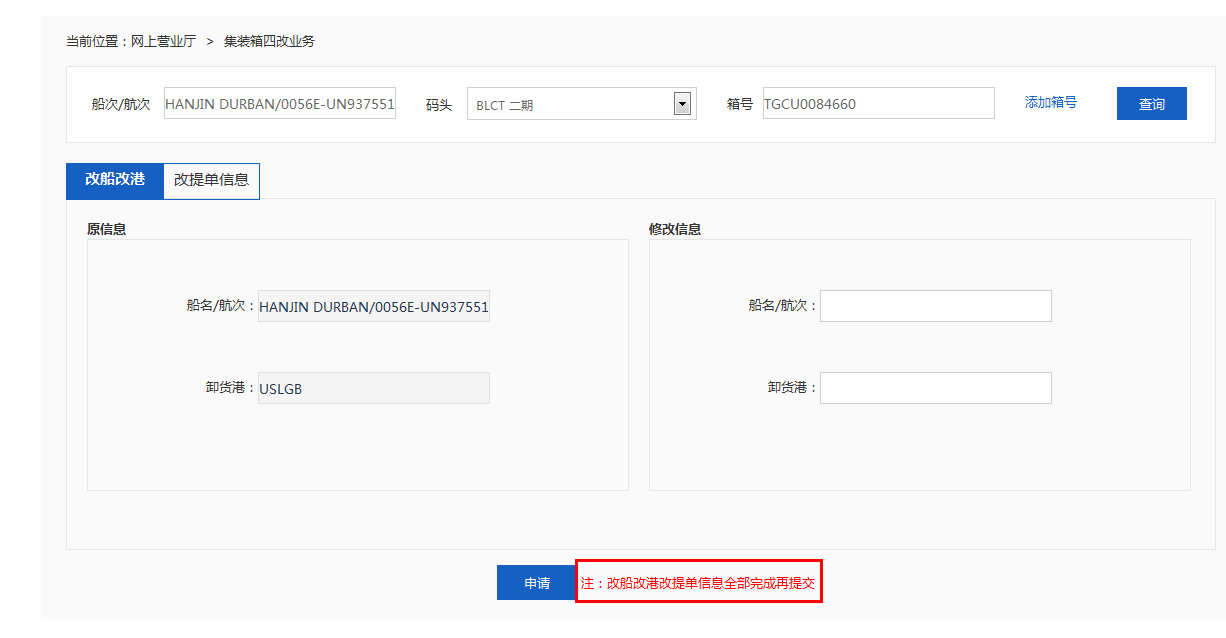 注:既有改船/改港,又改提單信息的則須全部修改完畢后再點(diǎn)申請(qǐng)