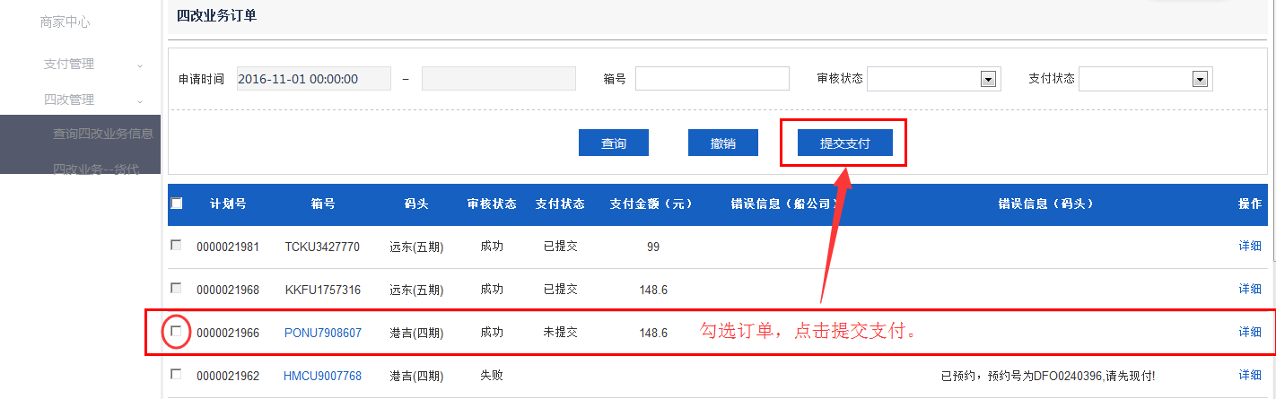 2.1四改管理 ——查詢四改業(yè)務(wù)信息頁面查詢結(jié)果詳情,勾選并點(diǎn)擊提交支付